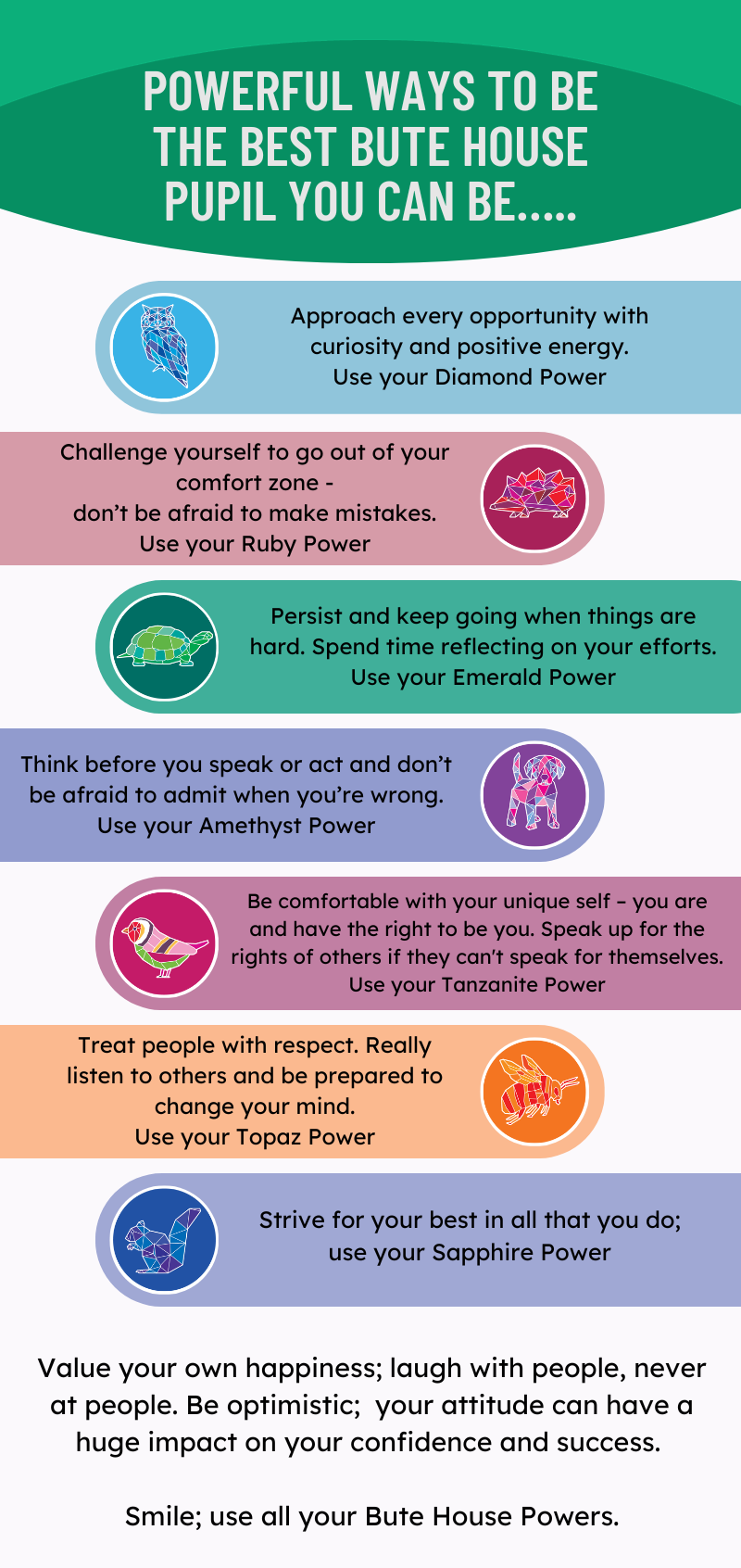Rather than referring to the pupil behaviour agreement as a ‘Code of Conduct,’ our pupils helped generate a list of overall ways we expect each other to behave at school, aptly called ‘Powerful Ways to be a Bute House Pupil. This list is reflective of their day-to-day lives, as it outlines the ways they should be using their Learning Powers. These expectations have been adapted to be age-appropriate for EYFS, KS1 and KS2 pupils. Posters are displayed in each classroom.